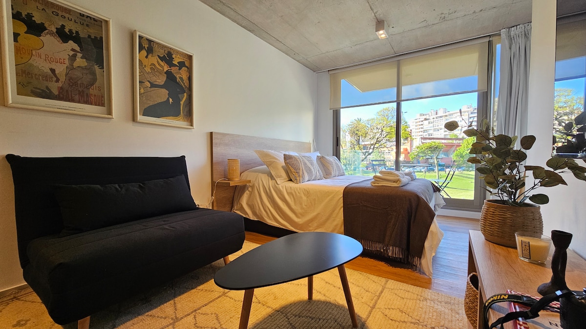 Design avec vue sur le parc et la mer dans le meilleur endroit de Punta Carretas Ce studio est idéal pour se reposer et profiter tout en visitant Montevideo. À une courte distance des restaurants, des bars, du centre commercial et du club de golf. Climatisation, Wi-Fi, Netflix, Prime Video, Nespresso® avec capsules incluses, matelas premium, serviettes en coton, draps en coton à haute densité de fils. Arrivée automatique et accès permanent pendant votre séjour avec la serrure intelligente Yale® Smart lock.