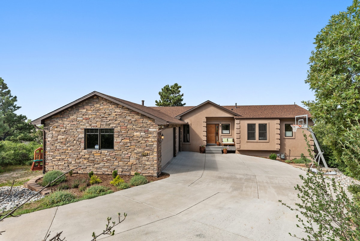 Appartement de sous-sol privé propre, accueillant et confortable avec une vue magnifique sur Pikes Peak et l'Air Force Academy. Grande chambre avec lit Queen Size confortable, salle de bain complÚte récemment rénovée, kitchenette (veuillez noter, pas de four ni de plaque de cuisson) et grand espace de vie avec télévision Roku, cheminée et de la place pour dormir et passer du temps. Situé dans un quartier calme à environ 2 miles de l'Académie de l'Air Force, avec un accÚs facile à l'autoroute pour les activités à Denver et Colorado Springs.