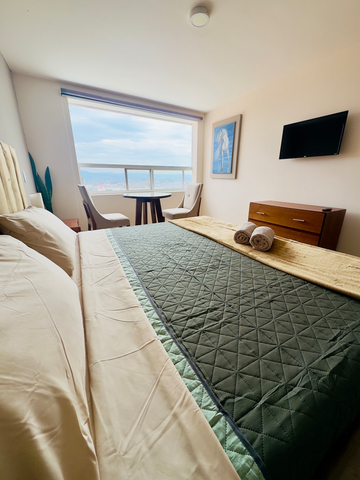 El Loft cuenta con cama tamaño KING SIZE (buen colchón), TV de 43", closet amplio y cocineta con parrilla de gas, utensilios de cocina, vasos, platos, cubiertos. La Habitación cuenta una ventana grande con vista panorámica el horizonte de la ciudad. Si traes vehículo puedes estacionarte afuera o a un lado del edifico, el barrio es muy tranquilo o existe una pensión a 2 cuadras ($80 la noche de 8 p.m a - 8 a.m ) El baño, cocineta, sala y cama son PRIVADAS. (no se comparten con nadie).