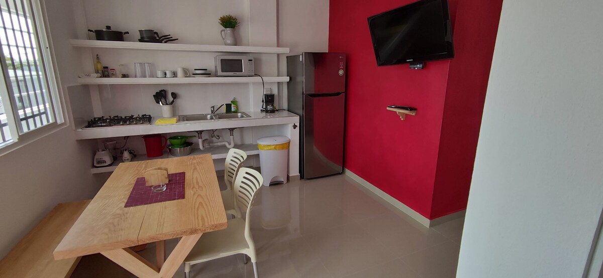 Suite independiente con baño completo, comedor y cocineta equipada. Nos encontramos en la zona de jardines de eventos de Jiutepec, Morelos. Diseñamos este espacio pensando en los huéspedes que asisten a bodas. Internet de hasta 500 mb para realizar home office. Oxxo y supermercados a 5 minutos en auto. Apps de delivery llegan. Estacionamiento dentro de la propiedad y vigilancia 24/7. Pregunta por nuestra promoción para viernes y sábado con salida tarde en domingo (sujeto a preaprobación)
