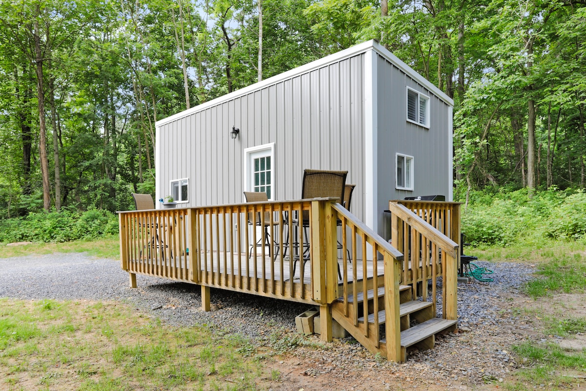Escapade spacieuse unique pour un couple, une petite famille ou un voyageur solo. Grande pièce de 30 pieds, mur de fenêtres donnant sur une grande terrasse, planchers de chêne, NOUVEAU JACUZZI dans un cadre privé. Chambre King avec salle de bain attenante ; le loft dispose d'un lit double. Moderne avec des touches de mcm et vintage, ce qui crée une retraite magique pour vous dans la cime des arbres. Sur 2 acres. Randonnée jusqu'au sommet de la montagne Cacapon depuis la porte arrière. À quelques minutes en voiture (3 min) de la piscine/du jacuzzi/de la pataugeoire communautaires privés (en été seulement). À 10 minutes de Berkeley Springs avec ses bains romains, ses arts, etc.