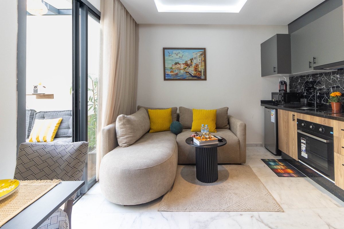 Profitez d'un logement élégant et central, dans l’hyper centre de Guéliz, en face du Mc Donald’s et de Zara, disposant de 2 clim, de la fibre et d’une grande terrasse. La suite Majorelle vous accueille dans un cadre idyllique, aux couleurs bleu et jaune, empruntés aux célèbres jardins Majorelle de Marrakech. 💛💙 Vous n’êtes pas véhiculé ? Pas d’inquiètude, La Suite Majorelle se trouve en plein cœur de Gueliz, près de toutes commodités/commerces accessibles au pied de la résidence.