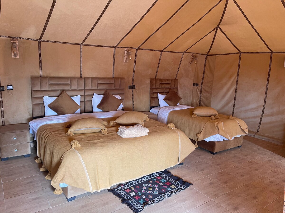 Notre camp, niché au milieu des dunes, abrite 10 tentes spacieuses, chacune équipée de toilettes et d'une douche privée. Chaque tente dispose d'une porte verrouillable individuellement de l'intérieur et de l'extérieur, avec un cadenas fourni gratuitement par notre service. À l'intérieur de ces tentes de 26 m ², vous trouverez un lit King Size et un lit simple, tous équipés d'une literie de haute qualité, y compris des oreillers, des draps et des serviettes.