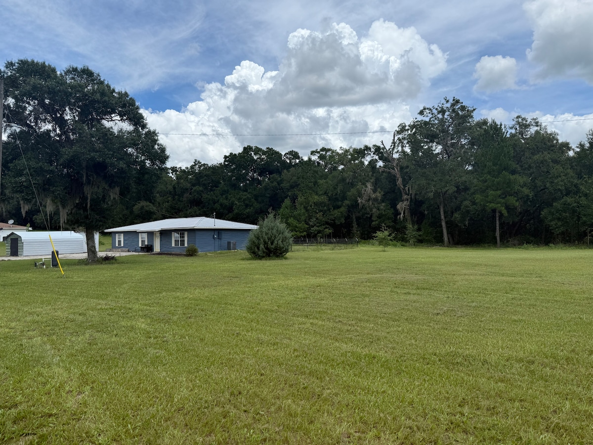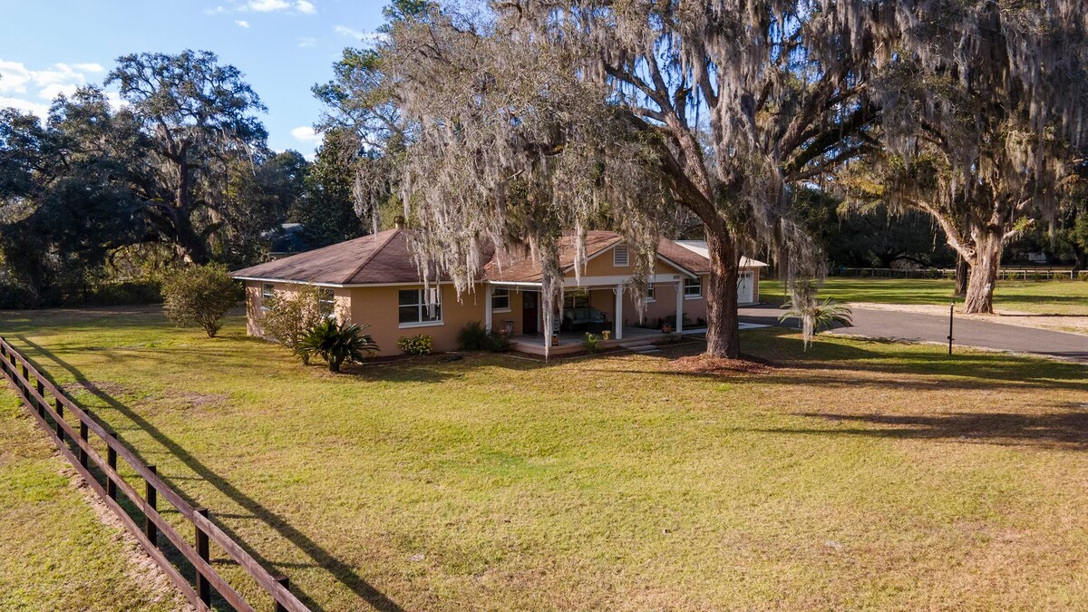 Bienvenue dans notre maison d'hôtes nouvellement construite, située au sommet d'une colline dans un cadre paisible de ferme, où les équipements modernes rencontrent l'évasion rurale. Profitez de votre café du matin sur le porche, entouré de chênes géants, où vous pouvez entendre les oiseaux chanter et regarder les animaux errer. Nous sommes situés à seulement 20 minutes du World Equestrian Center (WEC), à 15 minutes des HITS, et 30 minutes de Gainesville et de l'Université de Floride, dans l'épicentre du paradis des équestres et des plongeurs ! Les chevaux sont les bienvenus, veuillez vous renseigner.