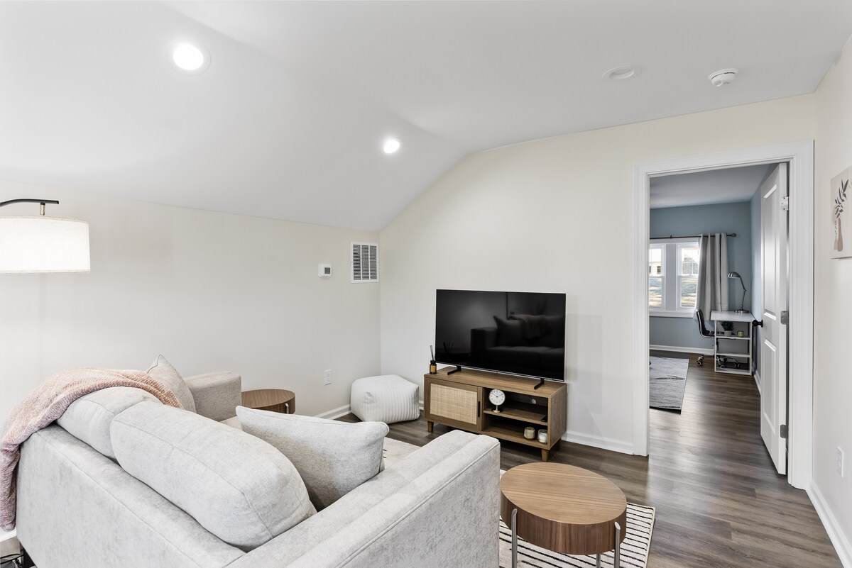 ✓un lit TwinXL supplémentaire - sur demande ! Appartement rétro moderne pour le✓ troisième étage 1, chic rétro moderne ✓ Parking gratuit dans la rue À ✓ 20 minutes en voiture de l'aéroport de Philadelphie Wifi ✓ ultra-rapide à 950 Mbit/s ✓ Lac à proximité ✓ SmartTv (include Diseny+, Hulu, ESPN) Avec les derniers films GRATUITS Kitchenette ✓ complète avec four à induction, réfrigérateur, micro-ondes, ✓bouilloire, café et thé. Linge de maison et✓ serviettes ✓ Shampooing, après-shampooing et nettoyant pour le corps ✓ Table à manger pour 2 personnes console ✓de jeu ✓ patio extérieur avec chaises ✓ Lit Queen Size