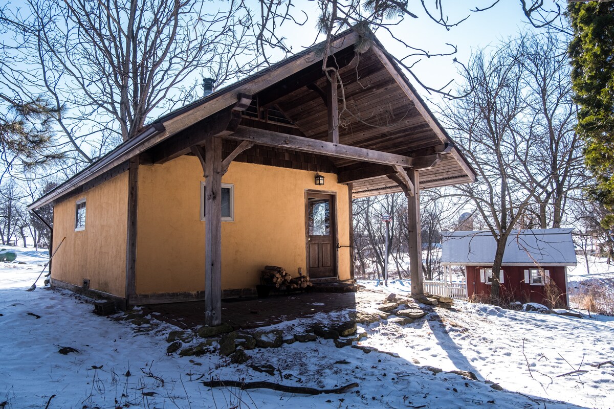 Cabane de campagne funky et bien rangée de 23 ans sur 120 acres de terres agricoles et de bois dans un cadre rural privé et calme. Elle est confortable, 950 pieds carrés, construite avec de la pierre et du bois. Concept ouvert avec une cheminée à deux étages, une cheminée de porche, un foyer et un loft ouvert pour dormir (1 lit), avec des escaliers en colimaçon, de nombreuses fenêtres, des planchers et des garnitures en noyer, des poutres en chêne et des plans de travail de cuisine en pin. La douche est grande et ouverte, avec des portes s'ouvrant sur une terrasse arrière pour une douche extérieure. Belle véranda couverte donnant sur des prairies vallonnées et des bois.