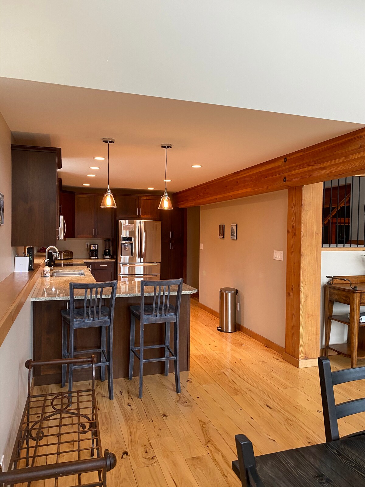 Venez profiter du confort de ce logement supérieur récemment rénové à l'emplacement idéal ! ! ! Ski à quelques pas du parking. Profitez de cette 2 chambres avec grand loft. 8 lits au total avec tout nouveau carrelage chauffant dans les salles de bains, douche personnalisée et salles de boue. Nouvelle cuisine avec plans de travail en quartz et entièrement équipée. Réchauffez-vous dans le sauna après une journée fraîche sur les pentes ! ! ! Vous souhaitez réserver les deux logements, consultez notre unité inférieure (Black Bear Suite) si vous cherchez à réserver tout le chalet !