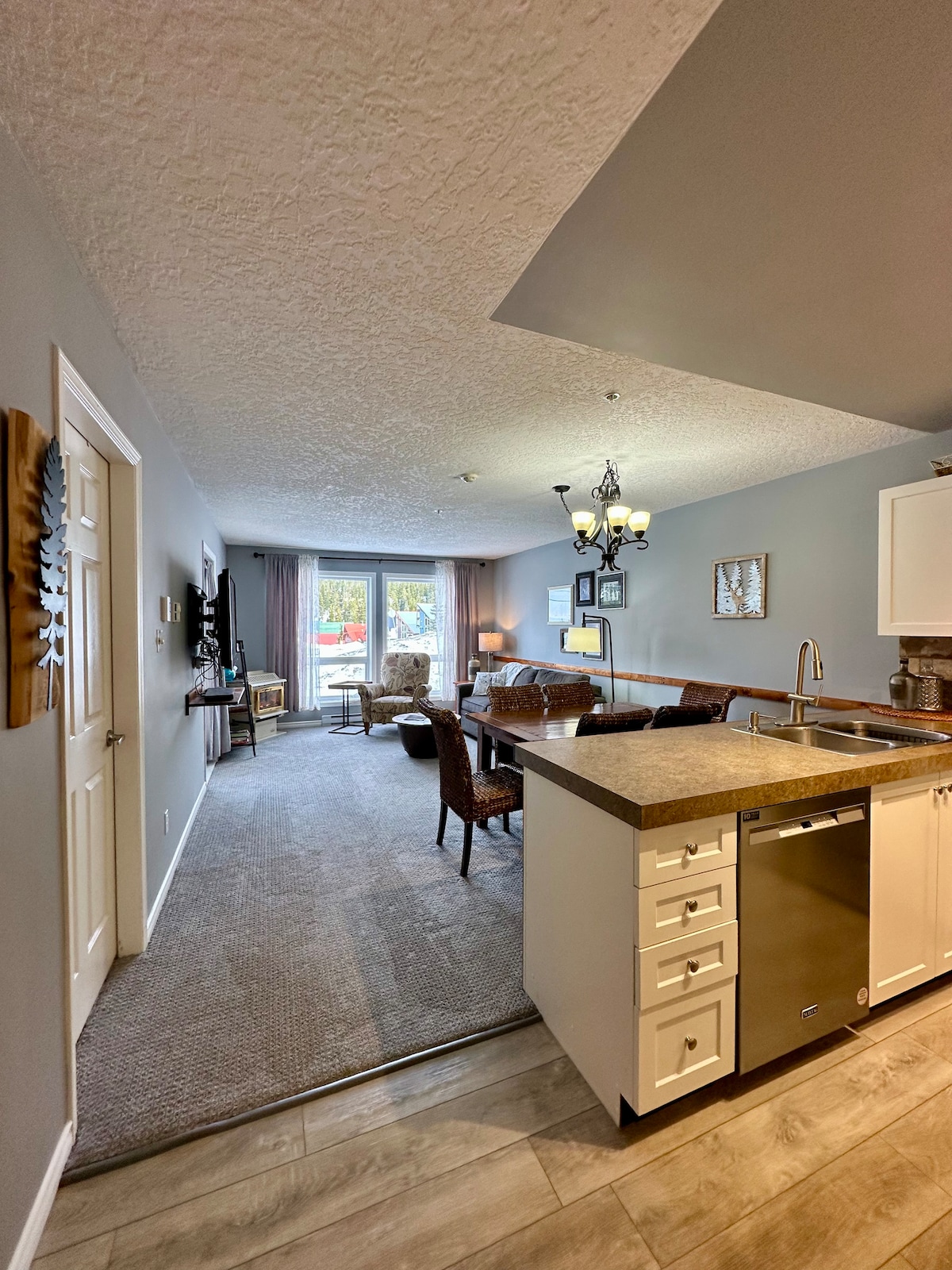 Amenez votre famille et vos amis dans notre suite spacieuse de 3 lits et 2 salles de bain à Deer Lodge. Cuisine entièrement approvisionnée, télévision Telus Optic, Wi-Fi gratuit, balcon privé donnant sur les pistes de Coaster/Linton's Loop. Un lit King Size, un lit Queen Size et des lits superposés Queen Size. Stores occultants. 2 salles de bain, une avec douche et une avec baignoire. Place de parking souterrain sécurisée, rangement pour skis/snowboards/vélos et jacuzzi partagé.