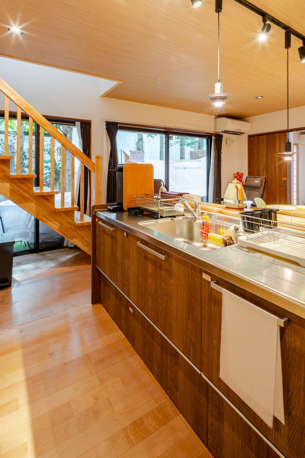 Ce logement est limité à un groupe par jour appelé « Private Resort Fuji » dans une villa à 11 minutes à pied du lac Yamanaka, rénové par un designer en juillet 2024. Il s'agit d'une maison japonaise au design moderne sur une superficie totale de 115 cabanes de 3LDK. Lorsque vous montez au deuxième étage, vous pouvez voir le grand mont Fuji depuis la fenêtre du salon, barbecue sur le grand balcon à l'arrière du mont Fuji, et après avoir profité du sauna en tonneau entouré d'arbres, vous pouvez prendre un bain dans la forêt dans l'espace de repos à l'extérieur.La cour dispose d'un grand brasero où vous pouvez même parler autour du feu.De plus, il y a une haute clôture dans le jardin, donc si vous amenez votre chien, vous n'avez pas à vous soucier de vous enfuir. La chambre dispose d'un grand écran de 90 pouces, où vous pourrez profiter de Prime Video, Youtube et plus encore.La nuit, vous pouvez également voir le ciel étoilé si les conditions sont bonnes.