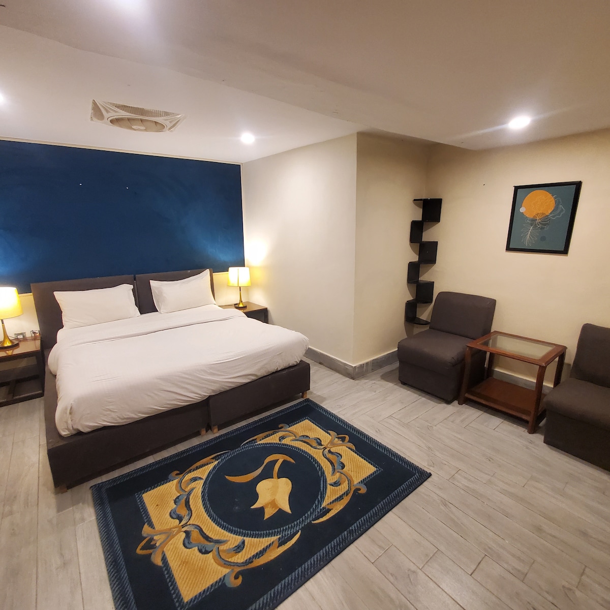 Séjour moderne, confortable et luxueux à Bahria Town Islamabad avec enregistrement automatique, parking gratuit, WiFi rapide et télévision compatible Chromecast. Profitez d'un lit King Size, d'un balcon privé avec vue et sièges, d'une kitchenette (réfrigérateur/congélateur, micro-ondes et bouilloire électrique) et d'une salle de bain approvisionnée. Petit-déjeuner et service en chambre disponibles sur demande et moyennant des frais. Café et restaurant sur place. Emplacement privilégié près des parcs, des centres commerciaux et des restaurants, à seulement 12-15 minutes en voiture de DHA2 et Giga Mall et à moins d'une heure de l'aéroport.