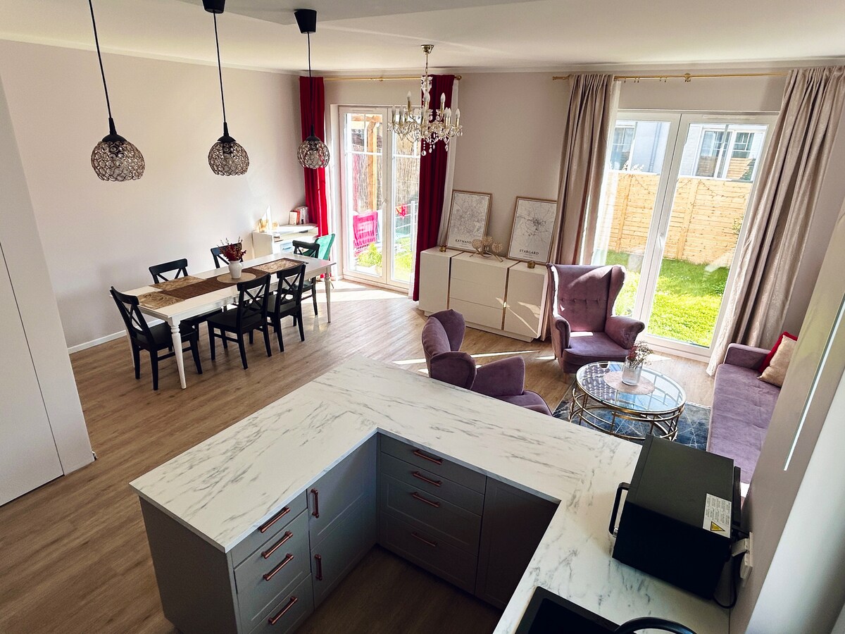 Construite en 2024, cette toute nouvelle maison offre un mélange parfait de style industriel et de confort confortable. À seulement 20 minutes en voiture de l'aéroport de Varsovie, il est idéalement situé pour les voyageurs à la recherche d'une retraite paisible avec un accès pratique à la ville. Il peut accueillir confortablement 4 personnes. Nous vivons à côté et nous nous ferons un plaisir de vous aider pendant votre séjour.