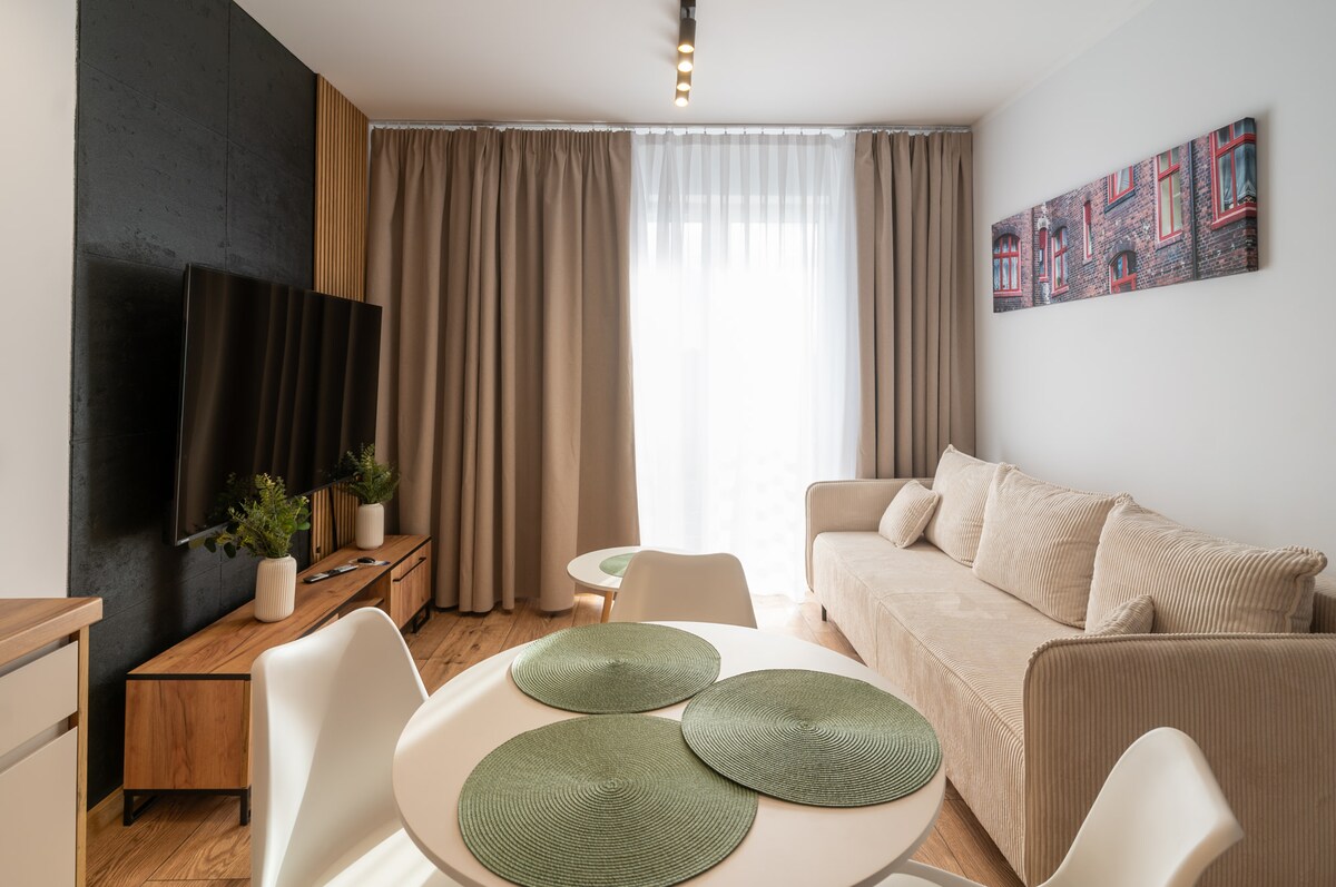 Nouvel appartement élégamment décoré dans un immeuble à côté de la vieille ville historique de Nikiszowiec Katowice. Deux chambres - une spacieuse, lumineuse avec un lit super confortable, l'autre plus petite, calme avec un espace de travail et un canapé-lit confortable. Salon lumineux et élégamment meublé, relié à une cuisine entièrement équipée (four, plaque à induction, micro-ondes, lave-vaisselle, machine à café). Dans le salon, une porte avec accès à un petit balcon avec deux fauteuils. Calme, confortable et à deux pas de la vieille ville.