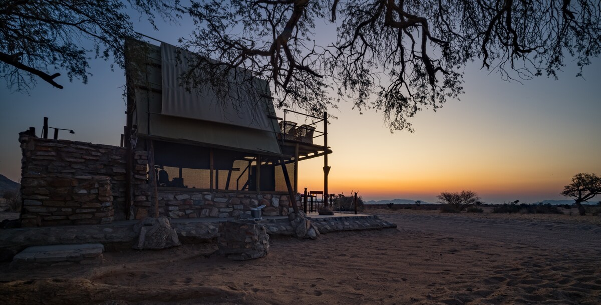 VOTRE SÉJOUR LE PLUS AVENTUREUX en Namibie est ici... Venez découvrir un lieu unique en Namibie. À seulement 15 minutes en voiture de Tsumeb et à une heure du parc national d'Etosha. Profitez du silence d'un environnement de brousse préservé, d'une vue magnifique sur les montagnes et d'une observation des oiseaux incroyable. Vous dormirez dans une tente de luxe hors des sentiers battus, avec piscine privée et salle de bains spacieuse. La tente de luxe est décorée avec goût et également écologique ; tous les appareils électriques sont alimentés par l'énergie solaire.