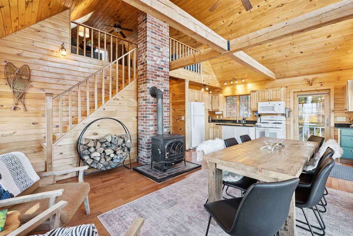 • Perfect for small families or couples, our signature A-Frame cabin features a modern interior gas burning fireplace, soaring ceilings, huge windows, stylish interiors, and all the comforts of home. • This cozy 1,100 square foot space comfortably accommodates up to four guests in two bedrooms (one with a King-size bed and the other with a Queen-size bed) and a shared bathroom. • 7 minute drive to downtown Freeport. • Proud to be ranked in the top 1% and voted Guest Favorite!