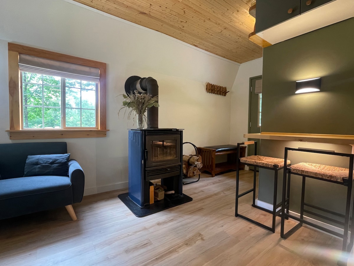 Évadez-vous dans un cottage à ossature de bois de rêve niché dans les bois du Maine ! Des poutres hautes, des sols chauffants, un lit mezzanine king size et un foyer crépitant vous attendent. Sirotez un café sur l'une des deux terrasses, faites une randonnée sur la montagne Bradbury (à 3 minutes), faites du shopping à Freeport (à 10 minutes) ou dînez à Portland (à 20 minutes), puis retournez dans votre refuge confortable sous les étoiles. Cuisine complète, plafonds voûtés, planchers chauffants, allée privée, foyer et vue paisible sur la forêt en font la retraite parfaite toute l'année.