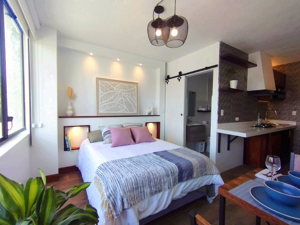 Situé à Tumbaco à 18 minutes de l'aéroport, vous allez adorer notre studio, il est élégant, confortable avec une belle vue sur Quito et ses belles montagnes. Vous trouverez ce dont vous avez besoin à la fois dans la cuisine et dans la salle de bain. Il est situé au deuxième étage (il est important de mentionner que le bâtiment n'a pas d'ascenseur). Vous aurez à votre disposition un parking sécurisé. Vous pourrez visiter la zone du verger de 1 500 m² avec différents types d'arbres et le jardin avant. Bienvenue dans ce charmant petit endroit !