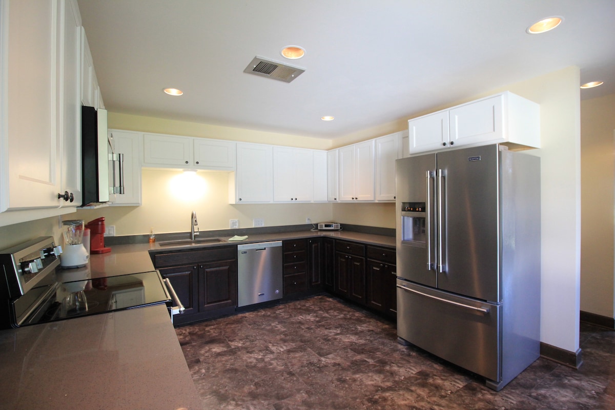 Il s'agit d'une maison privée de 3 chambres, canapé convertible, 1 salle de bain rien que pour vous, avec une cour spacieuse et une zone clôturée séparée pour vos bébés. La salle de bain est située entre les deux chambres du milieu (style Jack-n-Jill). C'est une maison plus ancienne et loin d'être parfaite, elle a donc quelques bizarreries et des améliorations sont en cours de route, mais elle dispose de tout le confort des créatures. Un parc de l'autre côté de la rue est super pratique pour les enfants d'aller brûler de l'énergie.