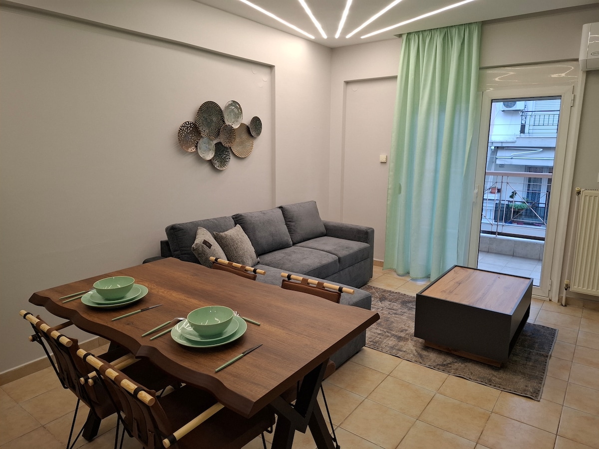 Voici mon appartement de 70 m² entièrement rénové à Sikies-Thessaloniki. Pour jusqu'à 5 personnes, à 3 km du centre-ville et à seulement 2' de la rocade. Le parking est vraiment facile, c'est donc l'endroit idéal pour les voyageurs en voiture. Balcon, ascenseur, connexion Internet stable, smart tv le rendent adapté aux séjours courte et longue durée ! N'hésitez pas à demander plus d'informations, mais nous espérons que tout est marqué en ligne. Nous nous ferons un plaisir de vous accueillir !