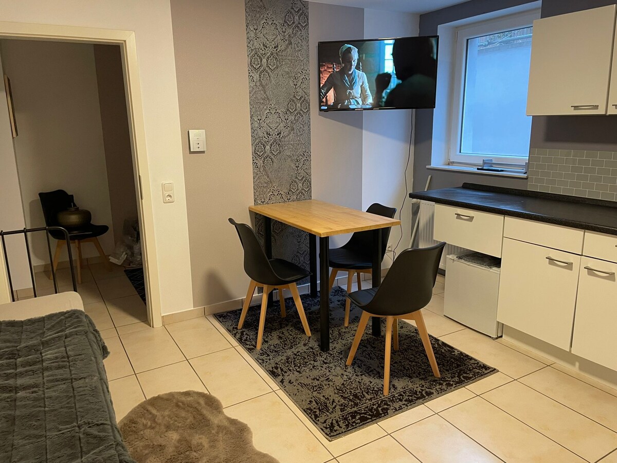 L'appartement confortable (45 m²) a été rénové en 2024 et est accessible en 5 minutes de la jonction de l'autoroute A45 ! Situé au sous-sol de notre maison, il dispose d'une cuisine entièrement équipée (un espace de couchage) avec TV et salle de bain avec lumière du jour, baignoire et machine à laver. La chambre à coucher séparée avec lit simple et canapé-lit (140x200cm) offre des places de couchage supplémentaires pour jusqu'à deux adultes. Notre maison est située dans un quartier résidentiel calme, REWE est à 2 minutes à pied.