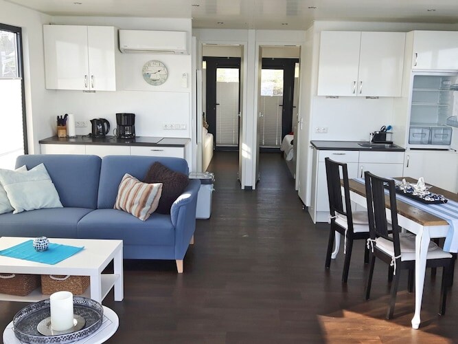 Le mobil-home actuellement fixe mesure 22,5 x 3,2 m et vous offre un moment confortable sur 2 ponts. Le bateau a été entièrement rénové, dispose de fenêtres à double vitrage et est parfaitement isolé tout autour. Pour les journées froides et l'hiver, il y a un chauffage central au gaz à bord.
