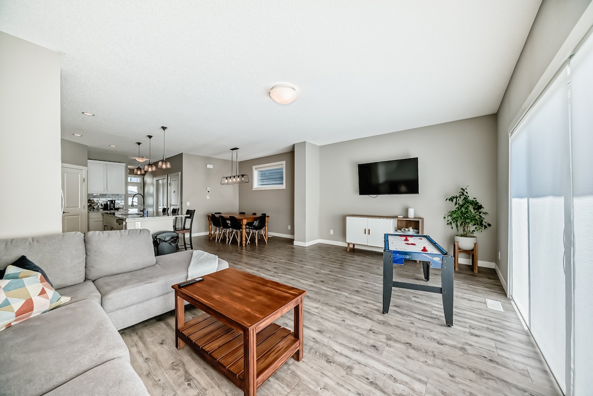 3+ 1 bedroom home in Seton, Calgary sleeps 10, open layout Fenced yard - perfect for pets, with large deck + BBQ Primary Bedroom - includes a balcony, KING size bed, + oversized ensuite bath Secondary Bedroom: KING size bed Third Bedroom: 2 double beds Office: double bed + infrared sauna Steps away from park, largest VIP theater, YMCA waterpark, skating rinks, + gym, South Health Campus Fully Equipped Kitchen - all cooking/baking needs, Keurig Coffee Maker etc. Extra Bedding+Pillows