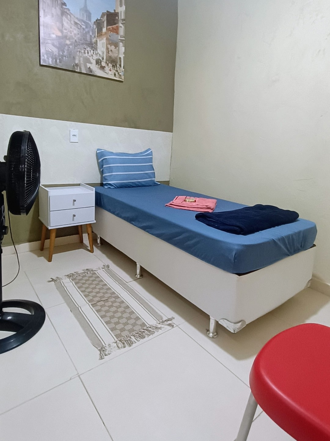 Espaço aconchegante, completo e privativo, ideal para relaxar com conforto e tranquilidade. Possui ar-condicionado, Wi-Fi, TV, cama guarda-roupa e banheiro privativo. Cozinha equipada com fogão, geladeira e microondas. Ambiente silencioso, organizado, com estacionamento coberto na entrada. Colchão extra para terceiro hóspede adulto ou criança disponível mediante taxa. Localização prática, próxima a supermercado com padaria, farmácias, academia e comércios em gerais.