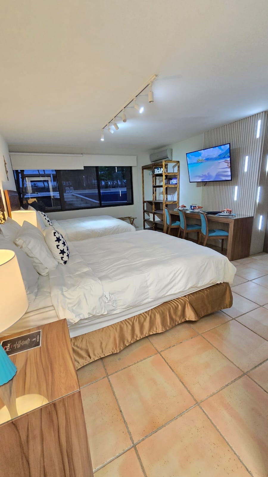 Ideal para una Persona o Pareja - Despierta con impresionantes vistas al mar en esta elegante habitación, diseñada para ofrecer confort y relajación. Cuenta con una cómoda cama matrimonial, baño privado y una terraza con vista al mar, perfecta para disfrutar de momentos tranquilos. Tendrás acceso a exclusivas áreas sociales que incluyen una hermosa piscina y zona de barbacoa. Además, podrás disfrutar de la increíble piscina de toboganes.