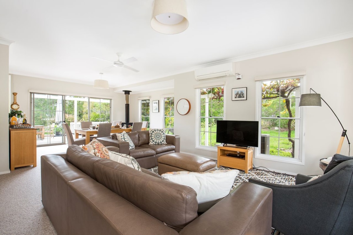 Détendez-vous instantanément tout en admirant la vue imprenable sur la côte depuis cet espace de vie élégant, à seulement 90 minutes au sud de Sydney et à 700 mètres à pied de Seven Mile Beach. Ouvrez les portes-fenêtres pour sentir la brise de l'océan et étendez l'espace sur une vaste terrasse. Ou installez-vous confortablement près de la cheminée pendant les mois les plus froids. Avec le petit-déjeuner servi et le salon extérieur, vous aurez l'embarras du choix pour vous réunir. Votre toutou peut courir librement dans la cour herbeuse entièrement clôturée et profiter du temps sur les plages de la région où les chiens sont acceptés.