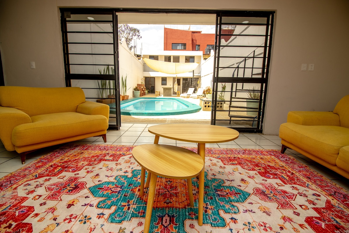 Loft central avec climatisation situé au rez-de-chaussée d'une maison familiale dans laquelle cinq autres sont loués et un autre est habité (tous partagent la piscine et le jardin). Proche des galeries d'art, de l'auditorium Guelaguetza et d'un marché traditionnel. À moins de trois pâtés de maisons de Santo Domingo et du déambulateur touristique. Éclairé et équipé. Idéal pour longs séjours. Idéal pour les familles et les couples.