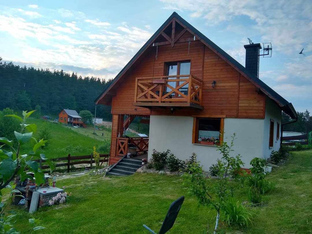 Un chalet de style cabane dans un jardin clôturé, grand et bordé d'arbres. Près de 1 000 m2 de verdure le rendent entièrement privé. Le quartier est calme. Trois beaux grands lacs à 500-700 m Les voyageurs peuvent compter sur une véritable pause dans l'agitation, le feu dans la cheminée, écouter le son des arbres, se vanter des grenouilles et chanter des oiseaux. Ici, vous reprendrez votre souffle dans un endroit sûr en pleine nature, au cœur de la Poméranie Kashubienne.