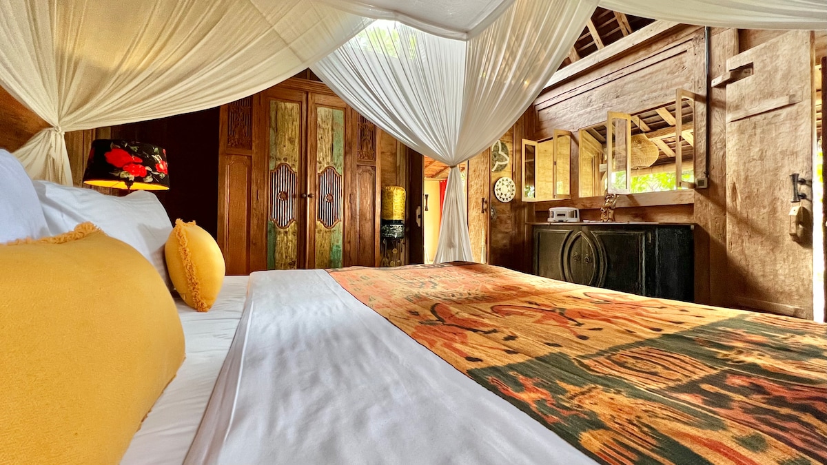 Ancienne maison javanaise rénovée authentique nichée dans un endroit naturel immensément beau à 4 km au nord d'Ubud avec des vues spectaculaires sur la jungle tropicale luxuriante et les volcans de Batukaru. ⛰️⛰️⛰️ Sanctuaire unique où vous aurez l'impression de remonter 20 ans en arrière à Ubud, où vous pourrez vous détendre, vous ressourcer, pratiquer le yoga et la méditation, recevoir des massages thérapeutiques ou un bain sonore avec des bols chantants népalais anciens, déguster des aliments sains faits maison et vous connecter à la nature qui semble très vibrante dans chaque brin d'herbe. 🌱