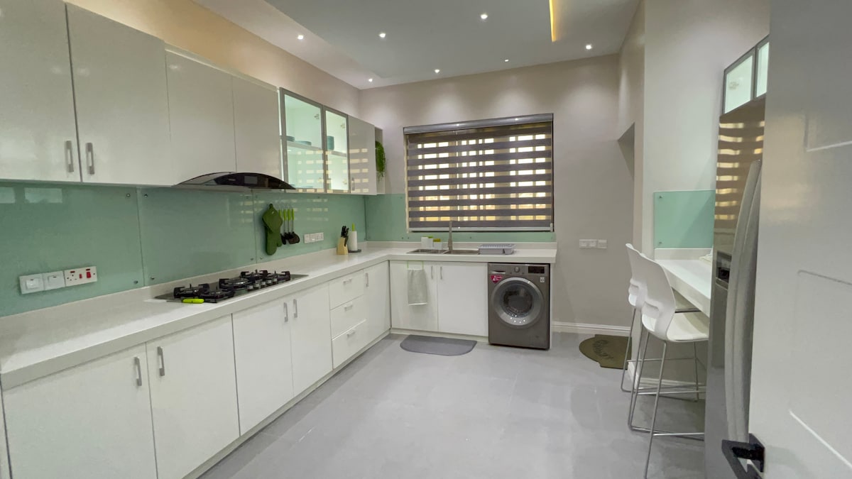Évadez-vous dans l'oasis tranquille d'Olumide au cœur de la ville ! Notre appartement de luxe de 3 chambres avec transformateur de 33 kVA garantit une alimentation électrique ininterrompue. Détendez-vous avec style avec nos somptueuses retraites king-size et deux retraites queen, chacune avec salle de bain attenante, pour un confort ultime. Restez connecté avec le Wi-Fi rapide, soutenu par un générateur de secours ! et Netflix avec nos téléviseurs intelligents de 65 et 42 pouces, une cuisine entièrement équipée et des balcons privés. Parfait pour les séjours longue durée, les familles et les groupes. Réservez et détendez-vous