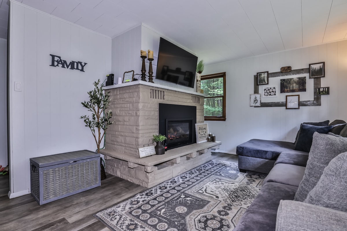 Maison confortable avec un éclairage et des couleurs de peinture chaleureuses et une décoration créative de Northwoods avec une touche de modernité. Les équipements comprennent une connexion Internet haut débit, des appareils électroménagers en acier inoxydable, une cafetière, un lave-linge et un sèche-linge à chargement frontal, des services de streaming/Apple TV, 3 téléviseurs à écran plat, 2 cheminées, la climatisation centrale et une fournaise à haut rendement. La maison est située sur 4 acres boisés (pas au bord du lac) au large d'une route de gravier bien entretenue. Très privé. Aucun voisin en vue. La faune est abondante. Les chiens sont acceptés avec approbation et frais.