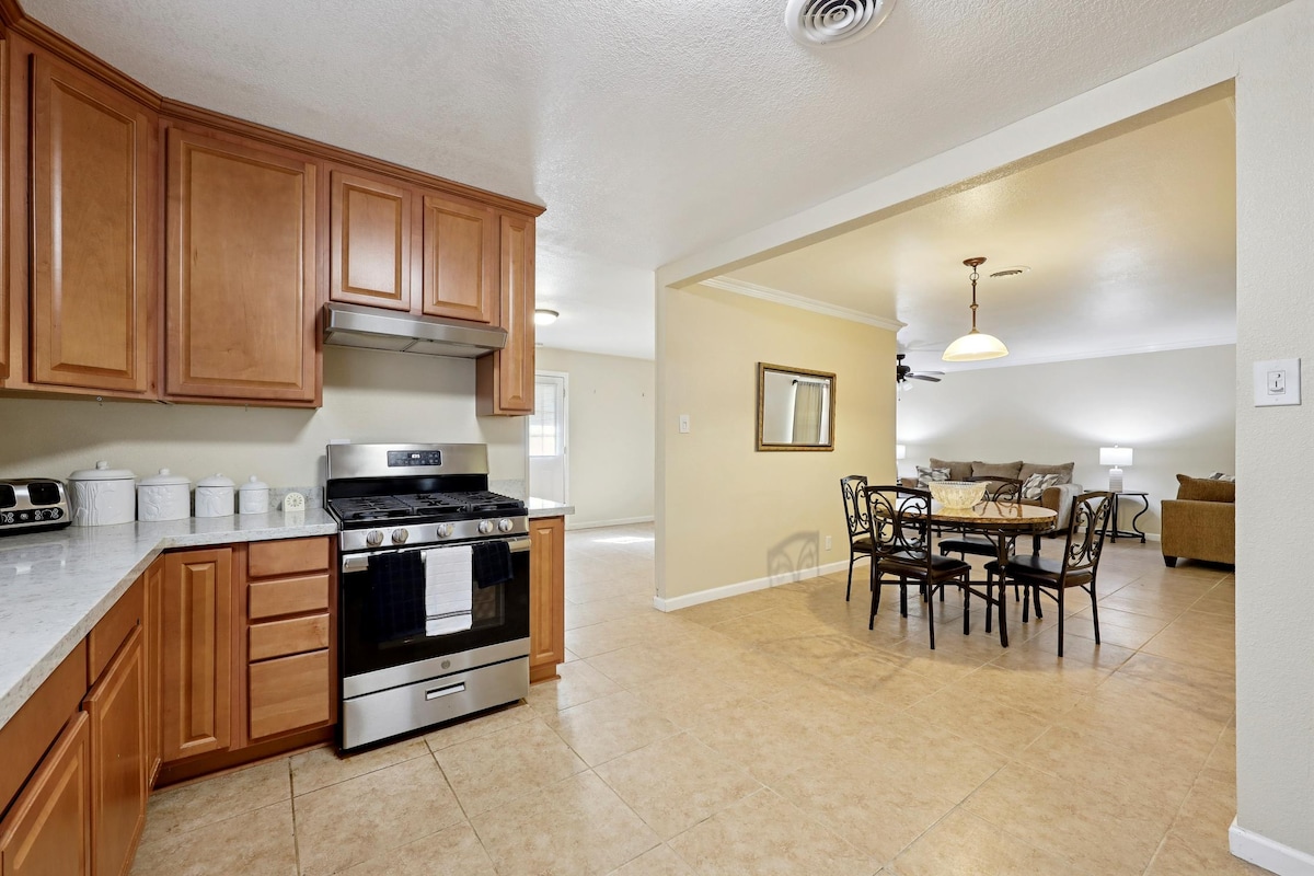 Cette maison est située sur le côté nord-ouest de Beaumont, près d'un parc avec piste pédestre dans un quartier calme et sûr. Vous obtenez 1850 pieds carrés de maison avec un garage pour 2 voitures et une ouverture de porte de garage, il y a 3 chambres, 2 salles de bain complètes, un coin repas, la télévision par câble, le Wi-Fi, un espace bureau, un lave-linge/sèche-linge, la climatisation et le chauffage centraux, tout électrique sans soucis de connexion au gaz, clôturé dans la cour arrière, à environ 1 mile de l'autoroute. À proximité de restaurants populaires et d'un centre commercial. Tout compris, vous apportez votre nourriture et vos vêtements !