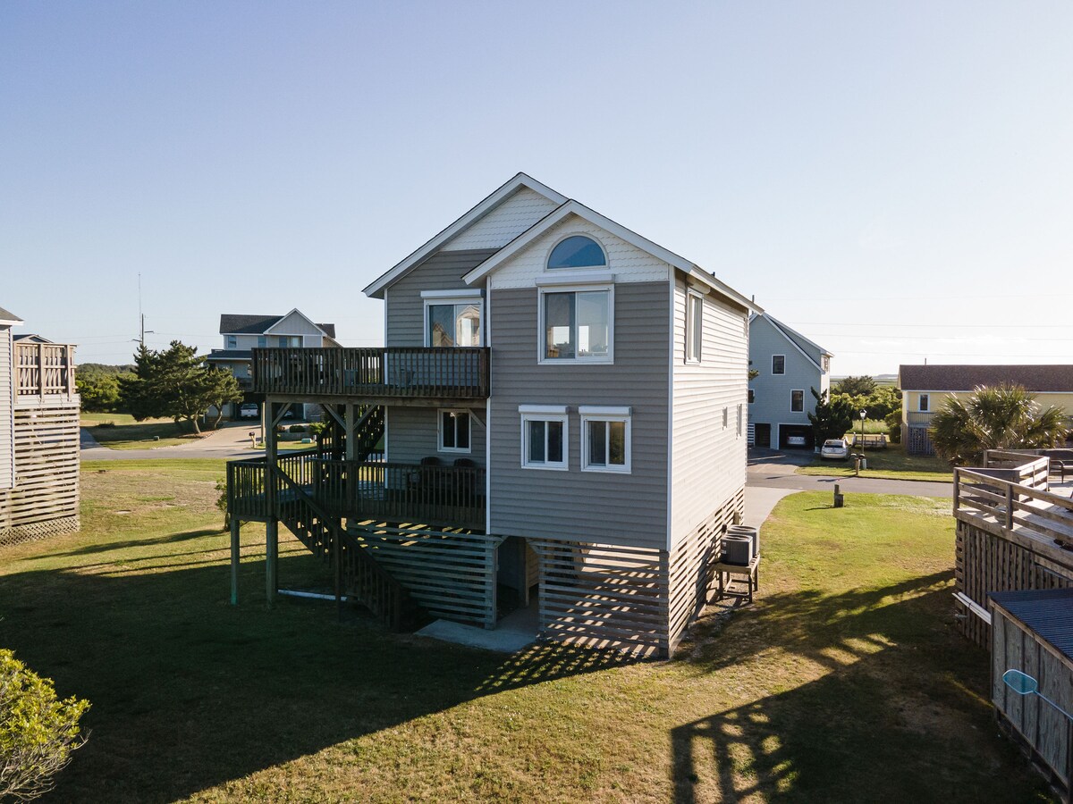 Réduction disponible pour les séjours prolongés Profitez de cette maison de plage confortable, à distance de marche de l'océan Atlantique et du Pamlico Sound. Parfait pour les amateurs de plage, de kiteboard, de sports nautiques ou pour des vacances en famille ou entre amis. À l'intérieur, vous trouverez deux salons, dont un avec table de billard et bar. Téléviseurs grand écran avec câble haut de gamme et son surround dans chacun. Profitez de l'observation des étoiles tout en vous relaxant dans le jacuzzi sur la terrasse. Situé dans les trois villages, à proximité des restaurants et des commerces.