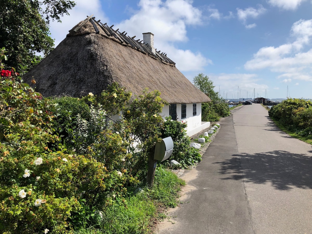 Ce chalet au toit de chaume de 1805 est situé au bord de la mer en tant que dernière maison sur la jetée dans un petit village. Vous pouvez faire de merveilleuses promenades dans les forêts voisines ou vous pouvez simplement vous asseoir dans le jardin ou à l'intérieur de la maison et profiter de la vue spectaculaire - sur trois côtés de la maison, votre vue sera la mer. À l'intérieur de la petite maison confortable, vous trouverez deux chambres avec des lits doubles. Mais si vous préférez dormir « dehors » dans l'annexe du jardin, un lit double vous y attend (la chambre peinte en rouge).