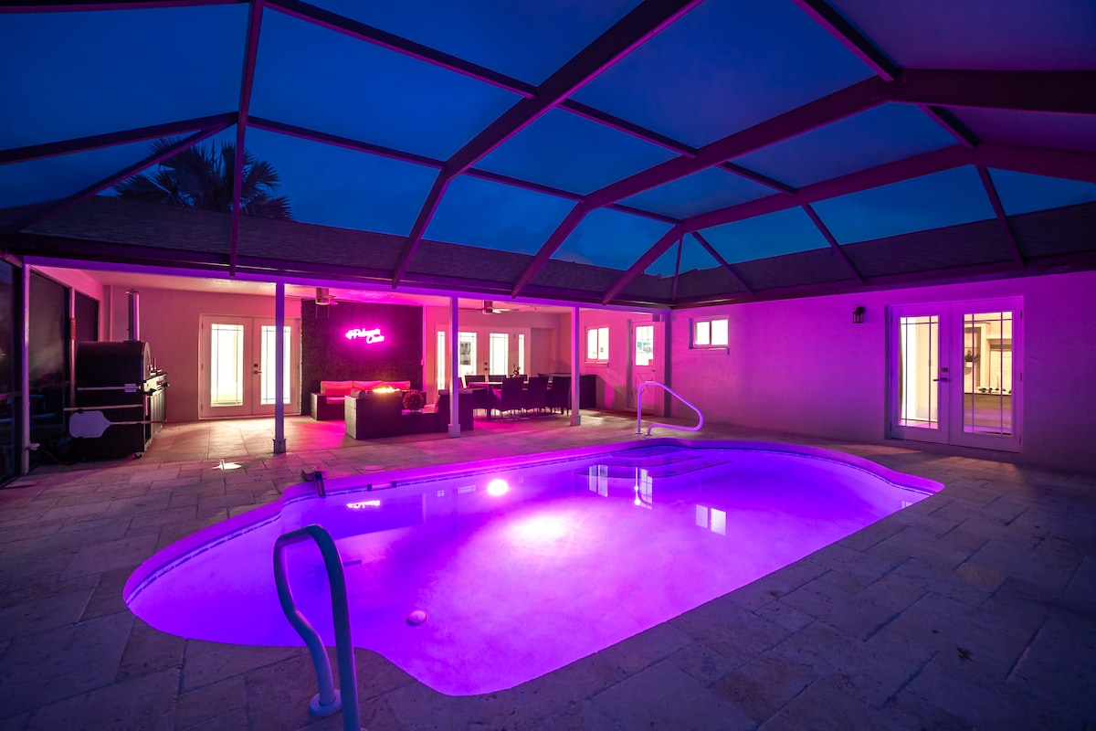 Bienvenue à Palmasis Oasis ! L'escapade ultime à Palm Coast ! Détendez-vous dans une piscine privée, cuisinez dans une cuisine gastronomique intérieure et extérieure et profitez de l'accès au quai du canal. Détendez-vous dans le salon spacieux avec une télévision QLED de 86"et son surround ou organisez une soirée cinéma avec la machine à pop-corn. Peut accueillir 10 personnes confortablement, avec 3 salles de bain complètes et 5 lits, dont une suite parentale luxueuse. Observez les dauphins ou les lamantins depuis le quai et profitez de barbecues sur une installation extérieure de 12 pieds avec un four à pizza. Un pur bonheur vous attend !