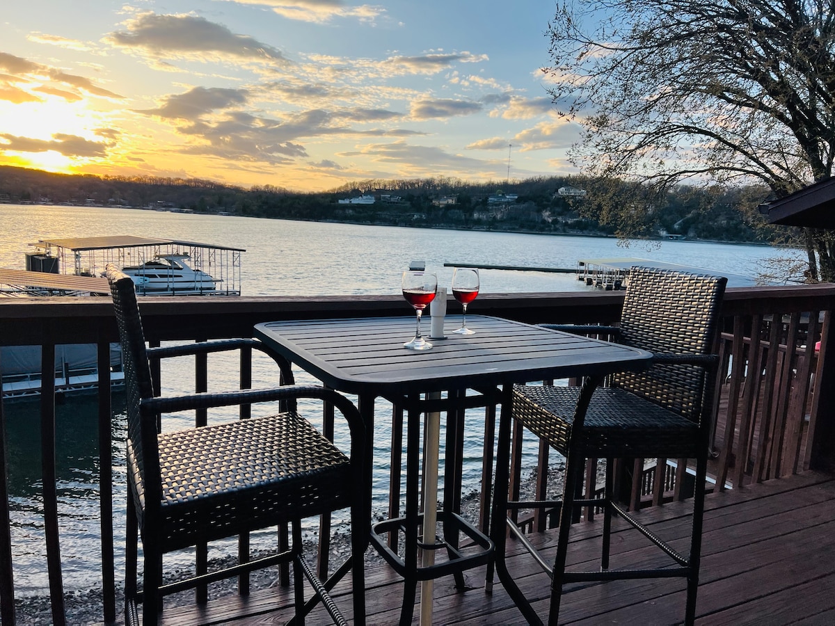 Charme rustique + équipements modernes. Notre cabane des années 1930 repose au sommet de l'un des couloirs de vue les plus recherchés du lac. À plus de 100 pieds au-dessus de l'eau, offrant une vue sur les feux d'artifice locaux, de magnifiques couchers de soleil et un point de vue spectaculaire lorsqu'il y a de l'activité sur le lac. Niché dans la nature sauvage, les jours et les nuits paisibles sont nombreux. Situé au cœur d'Osage Beach avec accès au lac à proximité, steak house et bar à vin.