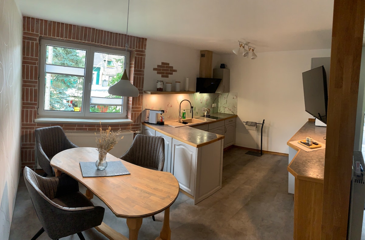 Nous proposons un appartement meublé avec style, avec une entrée indépendante et une intimité maximale. En outre, le sauna peut être utilisé moyennant un supplément (15 € par personne et par jour). Le paiement se fait sur place. Les animaux domestiques sont les bienvenus chez nous. Pour le nettoyage final, il faut compter 25 €. L'emplacement est un point de départ idéal pour la randonnée et le vélo. Le Harz et des villes comme Wernigerode, Goslar, Halberstadt, Blankenburg, etc. sont à 30-45 minutes en voiture.