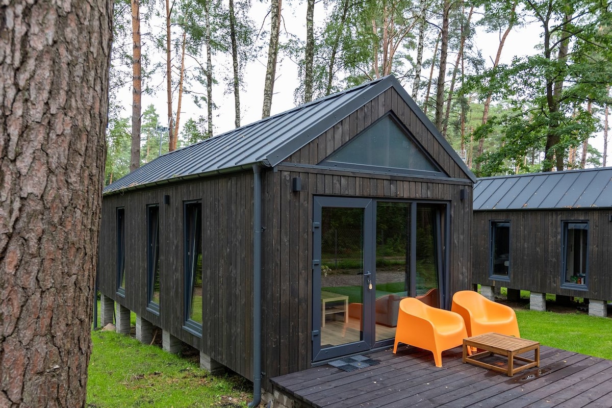 Un endroit pour se détendre et travailler. Il y a un bureau et une bonne connexion Internet. Il s'agit d'une nouvelle maison de plain-pied toute l'année, très chaleureuse, d'une superficie de 45 m2 avec cheminée et équipement complet, grand réfrigérateur, plaque à induction complète, four, lave-vaisselle et lave-linge moderne. Chambre confortable avec lit 160 x 200 cm et canapé-lit dans le salon pour 2 personnes. Salle de bain avec cabine de douche avec miroirs sur les murs et fenêtre. Belle literie + serviettes doubles pour chaque personne. Deux parents avec deux enfants est le choix optimal.