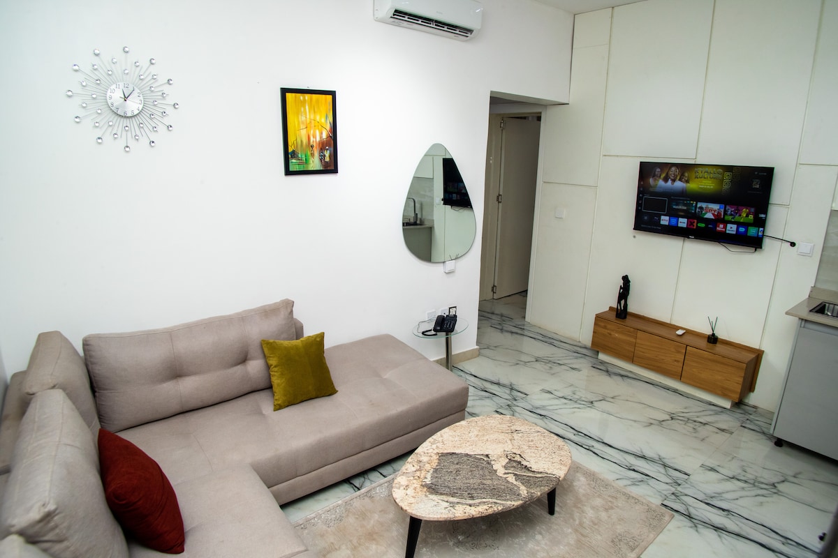 Découvrez le mélange parfait de style, de confort et de commodité dans cet élégant appartement d'une chambre situé au cœur d'Ikeja GRA, à Lagos. Entrez dans un espace moderne soigneusement conçu avec des finitions haut de gamme, avec une chambre spacieuse avec une salle de bains privative, un salon confortable et des toilettes pour les visiteurs supplémentaires pour plus de confort. - À 10 minutes en voiture de l'aéroport - Énergie et énergie solaire 24h/24 - Internet MTN 5G ultra-rapide - Netflix - DSTV - Gated Street with 24 hours dedicated compound security.