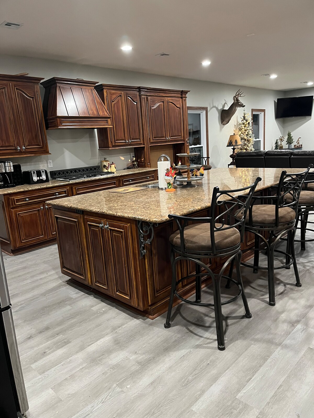 Spacieux avec cuisine complète. Grand patio couvert avec tables multiples. Trois types de grils différents à l'extérieur. Douze acres attachés pour qu'il y ait plein d'espace extérieur.