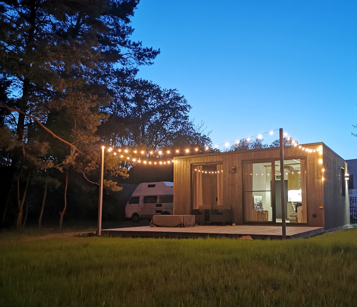 Plongez dans la nature dans un chalet design sur un grand terrain clôturé de 15 000 m², sans voisins. Un lit king size, des intérieurs en bois parfumé, une cheminée confortable et la climatisation vous attendent. Entièrement équipé : cafetières (aeropress, chemex, cafetière), Internet rapide (200 Mbps), kitchenette, grande terrasse, foyer et grill. Articles de toilette écologiques et serviettes douces inclus. Chalet réservé aux adultes.