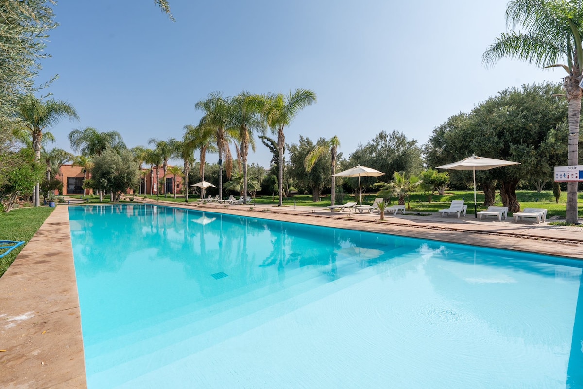 Vivez l'élégance avec la touche marocaine dans l'endroit luxueux de Marrakech ( La palmeraie). Entourés des palmiers , vous profitez : - Canapé moderne convertible en lit deux double - Chambre élégante avec matelas haut de gamme - TV Smart Wifi, Netflix et IPTV - Cuisine entièrement équipée - Grande Salle de bain - Terrasse vue panoramique pour profiter des petits déjeuner et vos pauses. La résidence offre une très grande piscine, grand jardin et un parking gratuit sur place