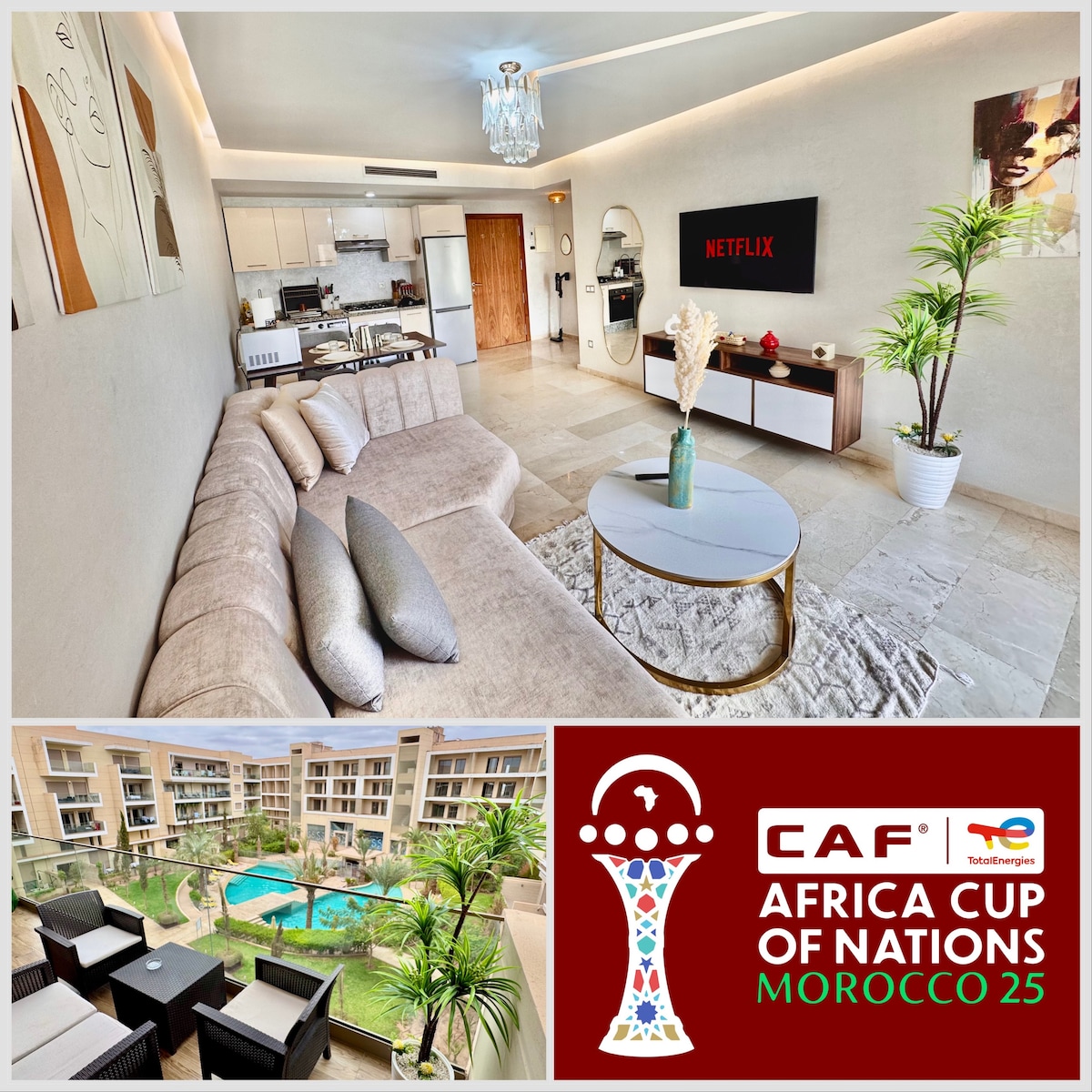 Évadez-vous dans un cadre élégant et relaxant à Marrakech! Appartement moderne et confortable, parfait pour un séjour inoubliable. Plongez dans la piscine de style complexe hôtelier et profitez aussi d’un accès au parc aquatique disposant de 2 piscines dont une exclusivement pour femme et de plein d’autre activités pour vos enfants Cet appartement soigneusement aménagé comprend . Un canapé d’angle convertible . Une cuisine entièrement équipée Une suite avec un lit queen size Accès autonome