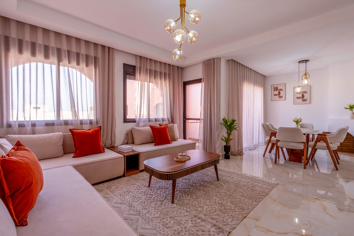 Séjournez en plein cœur de Marrakech dans notre appartement 2 chambres et 2 salles de bain. Profitez d'Une literie Simmons haut de gamme, WiFi haut débit (fibre optique) et d'une décoration moderne avec un bassin privé. Cuisine entièrement équipée, baignoire élégante, et douche italienne. À quelques pas de la place Jemaa el-Fna, du Plazza, et du Carré Eden. La piscine n’est pas chauffée. NB: Les couples marocains non mariés ne sont pas autorisés.