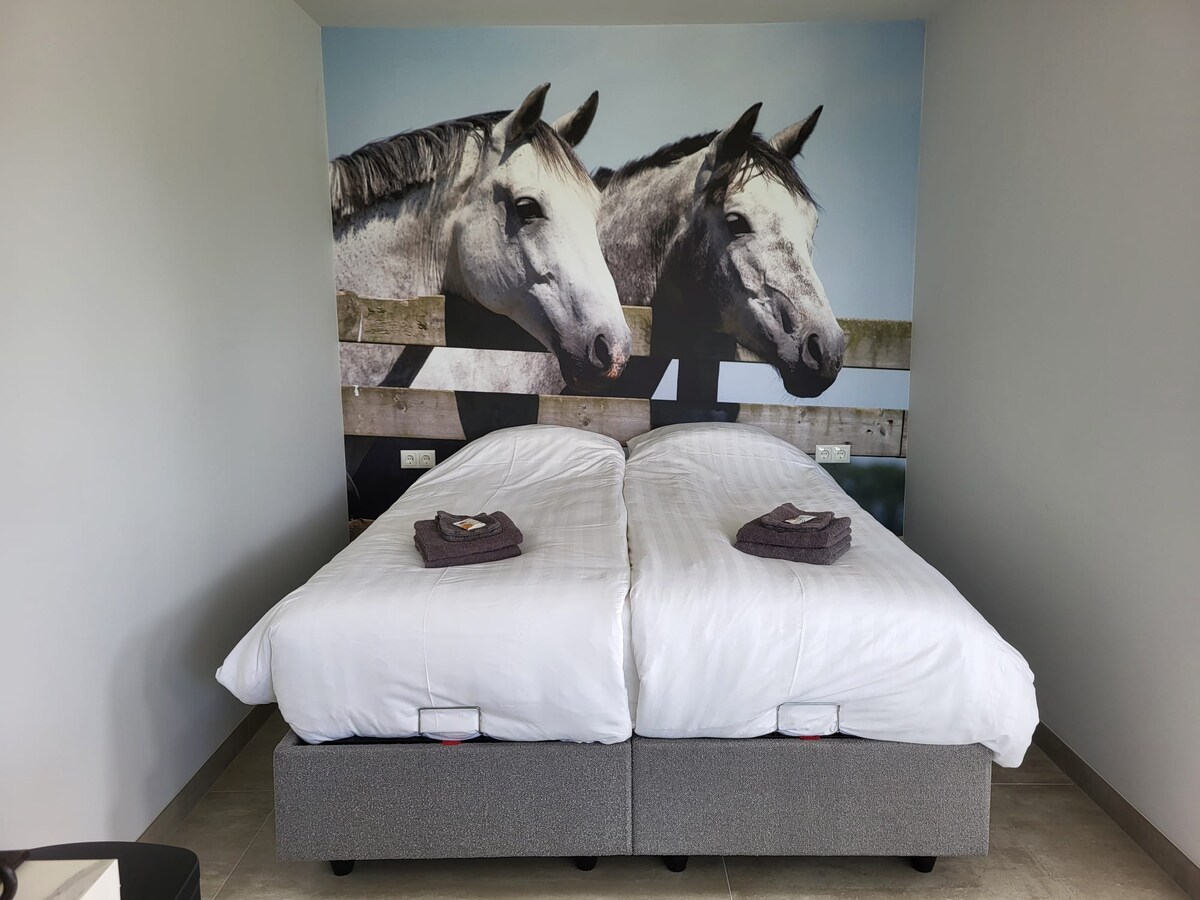 Bel appartement avec 2 chambres. Entièrement à vous. À l'arrière, un salon de jardin spacieux avec cheminée et un jardin privé. Vous pouvez chauffer la véranda avec la cheminée. En hiver, il peut faire trop froid pour s'asseoir là avec seulement la cheminée. La salle de bain dispose d'une baignoire pour 2 personnes et d'une douche double. La salle de bain dispose également d'un lave-linge et d'un sèche-linge. Magnifique appartement pour séjourner seul et profiter de la tranquillité !