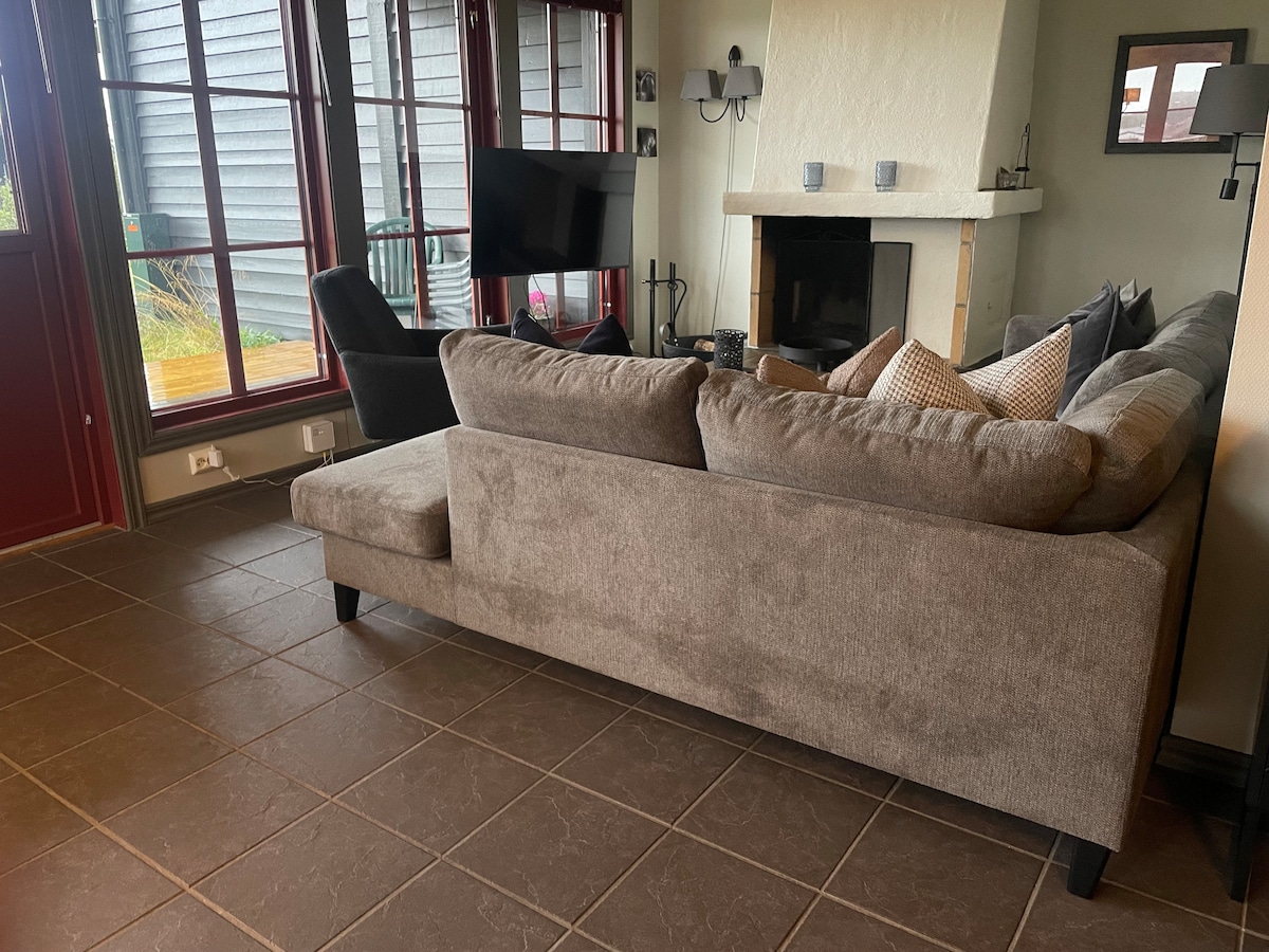 Feriehytte 6 is a stylishly furnished apartment with bedroom and loft in the center of Beitostølen. Here there is a sheltered terrace with outdoor furniture and lawn, a bright and sunny living room and wood-burning stove. There is also a well-equipped kitchen with a dishwasher, Nespresse Sage coffee machine, fridge, freezer and kettle. Dining table with room for 6 people. Bedroom with double bed. Stairs to the loft from the living room, which has two mattresses