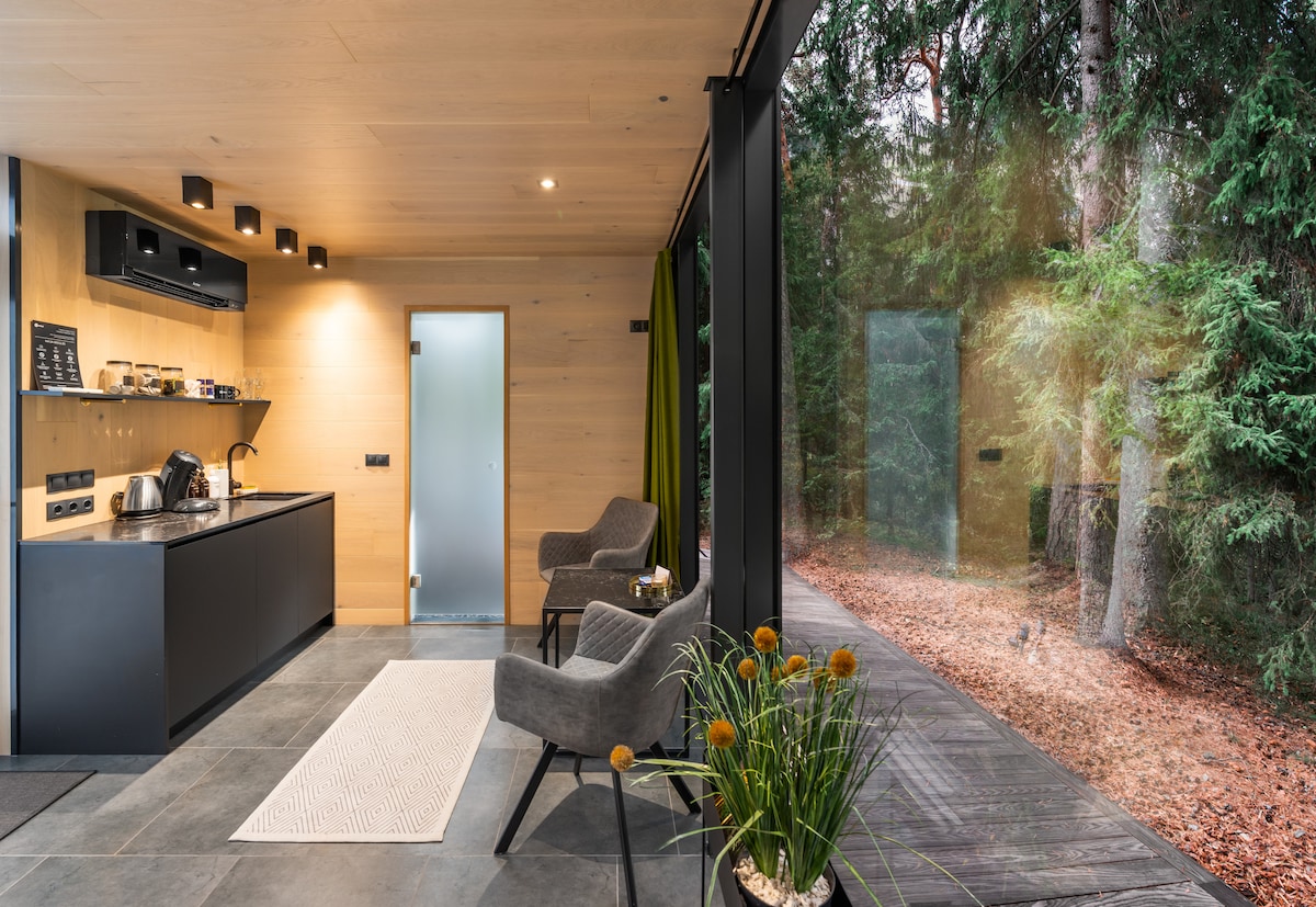 Cette micro-maison compacte et moderne est située sur la côte ouest de l'Estonie. Destinée aux personnes qui souhaitent profiter d'une retraite naturelle sans renoncer aux commodités modernes. La maison comprend un sauna, un jacuzzi, une douche avec plancher chauffant, des toilettes, un salon ouvert et un coin chambre dans le grenier. La maison est équipée d'une connexion Wi-Fi, d'une télévision avec accès Netflix, d'une machine à café, etc. Le chauffage/la climatisation est assuré par un climatiseur intégré. La maison peut être appréciée toute l'année.