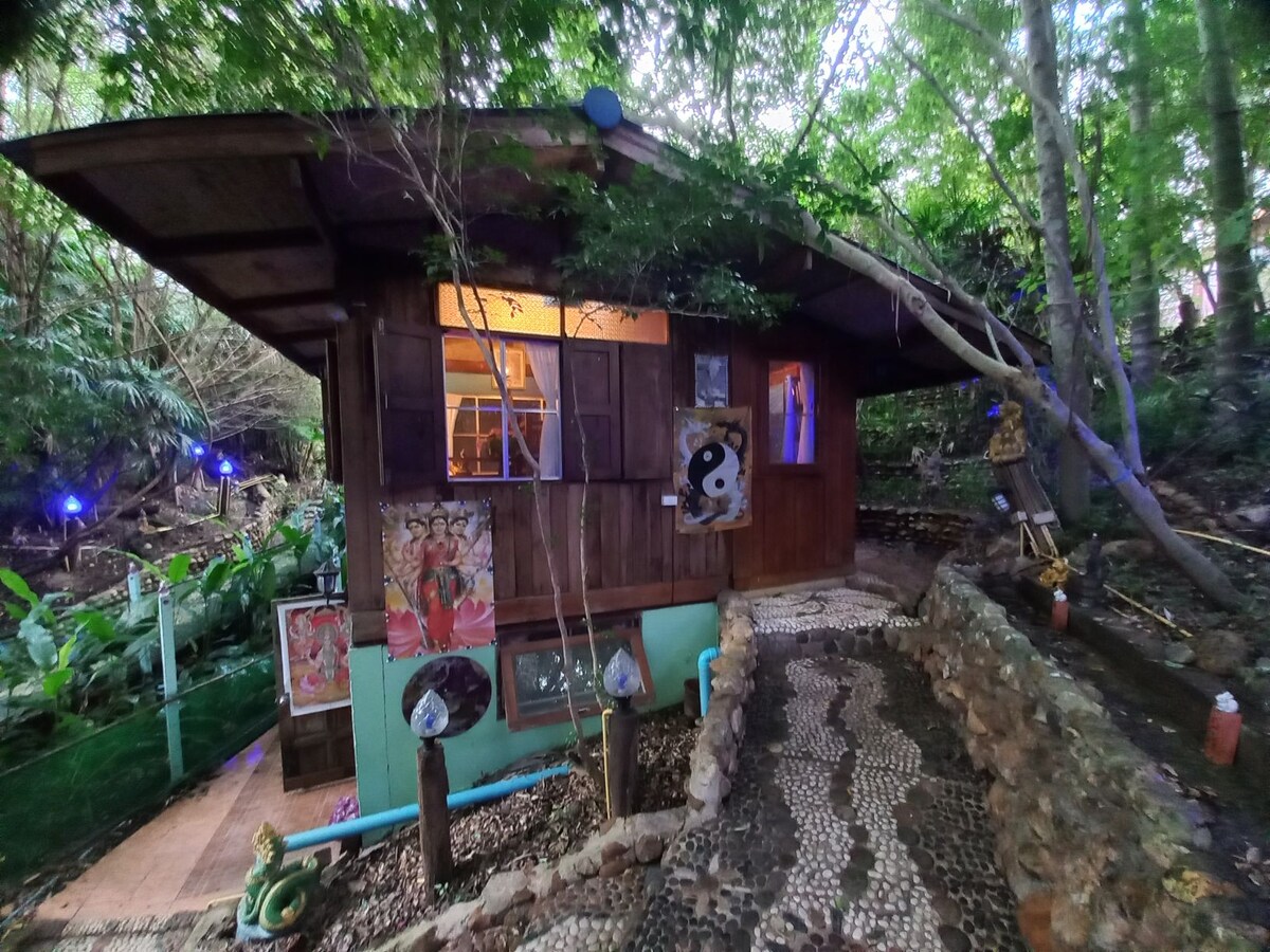 Nous gardons les choses simples ici. À 1 km à pied de la rue piétonne de Pai. Cadre paisible à l'écart de tout bruit. Réveillez-vous avec le chant du coq le matin avec le chat et le chien jouant dans le jardin, marchez dans la rizière et nourrissez la vache avec de la banane pendant la journée, et profitez du coucher de soleil l'après-midi. Tous les chalets sont équipés de la climatisation et d'une salle de bain privée. Des toasts simples, du thé et du café sont disponibles le matin.